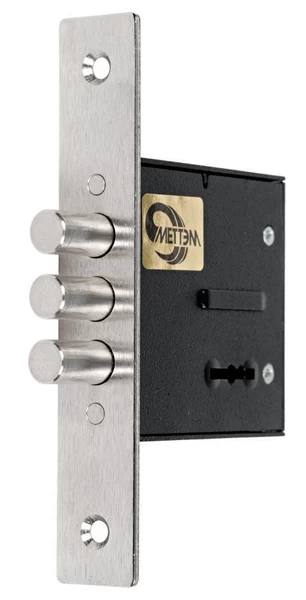Замок врезной сувальдный ЗВ8 852.0.0 сертифицирован на соответствие 2 классу ГОСТ. Подходит для установки как во входные двери (в качестве дополнительного запирающего устройства), так и в дверцы металлических шкафов. Замок имеет одно направление запирания — тремя стальными ригелями диаметром 12 мм, которые выдвигаются из корпуса замка на 22 мм. Замок запирает дверь на два полных полуоборота. Комплектуется лицевой планкой из высококачественной стали, а также двумя декоративными накладками на ключевую скважину из нержавеющей стали, тремя латунными ключами с пластиковой головкой. Замок не имеет защелки, поэтому рекомендуется к применению в качестве второго запирающего устройства.
