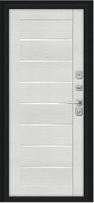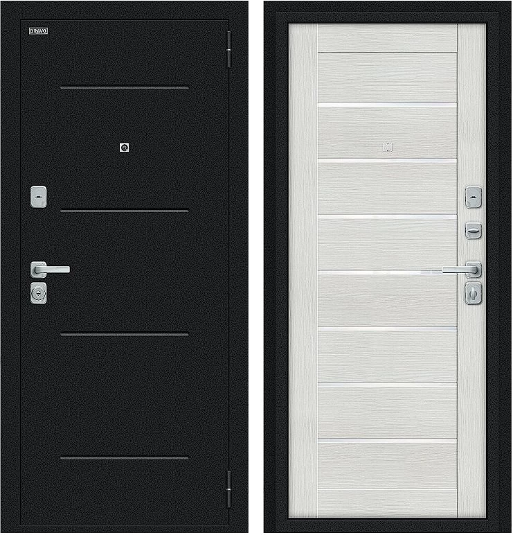 Надежная входная Дверь Браво Техно/BChrome Букле черное/Bianco Melinga премиум класса по цене 36 103 руб. Большая толщина стали защитит от проникновения в ваш дом, квартиру или коттедж. Используется очень качественная фурнитура: замки, цилиндры, ручки, защелки. Покрытие и отделка двери изготовлено под внимательным контролем производителя. Дверь имеет долгий срок службы и гарантию.