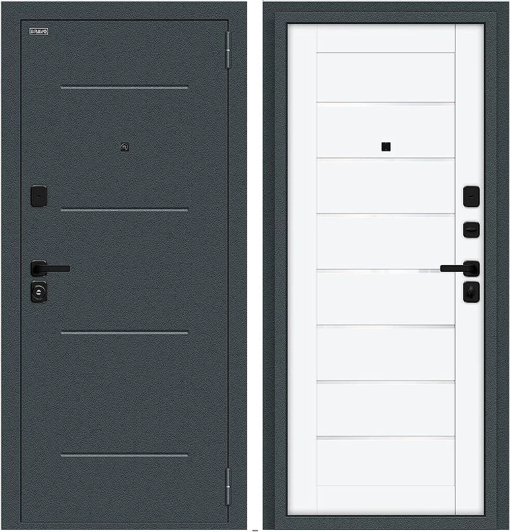 Надежная входная Дверь Браво Техно/SBlack Старк антрацит/White Silk премиум класса по цене 35 353 руб. Большая толщина стали защитит от проникновения в ваш дом, квартиру или коттедж. Используется очень качественная фурнитура: замки, цилиндры, ручки, защелки. Покрытие и отделка двери изготовлено под внимательным контролем производителя. Дверь имеет долгий срок службы и гарантию.